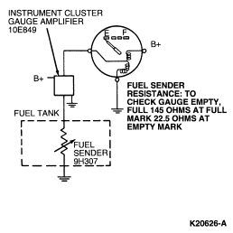 The sending unit changes resistance according to the level of fuel in the fuel tank, which varies the current flow through the gauge. The pointer position varies proportionately to the current flow. In this system, the sending unit resistance is low when the fuel level is low and high when the fuel level is high.