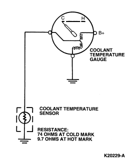 The water temperature indicator sender unit changes resistance according to the temperature of the engine coolant, which varies the current flow through the instrument cluster temperature gauge . The pointer position varies proportionally to the current flow. The instrument cluster temperature gauge resistance is high when the coolant temperature is low, and low when the coolant temperature is high.
