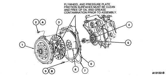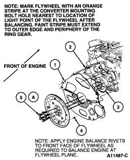 NOTE: If flywheel is to be replaced, check if original flywheel has balance pins or rivets installed. If so, new balance rivets (E2DZ-6A32-A) or equivalent must be installed on new flywheel in same position as on original flywheel .