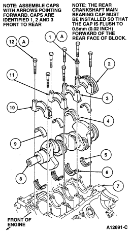 Install new crankshaft main bearings. Ensure tabs on bearing engages slots in the main cap and cylinder block .