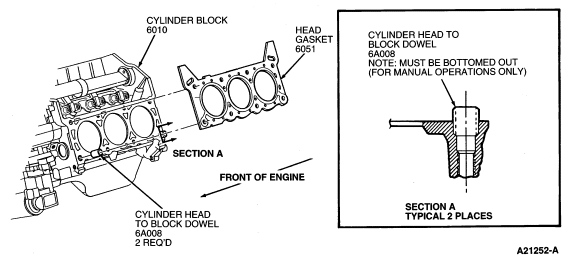 - Install new head gaskets using cylinder head to block dowels (6A008)