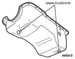 NOTE: When changing engine oil, both oil pan drain plugs (6730) must be removed to thoroughly drain the crankcase. One oil pan drain plug is located on the front of the oil pan and the other oil pan drain plug is located on the LH bottom side of the oil pan . Failing to remove both oil pan drain plugs when changing the engine oil can lead to an incorrect oil level reading after filling the crankcase with the specified amount of engine oil.