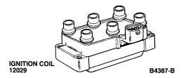 The ignition coil (12029) contains three separate ignition coils which are controlled by the ignition control module (ICM) (12K072) through three coil leads.