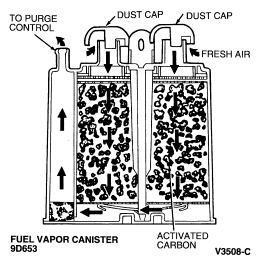 Fuel vapor emitted through the fuel vapor valve (9B593) is stored in a carbon-filled fuel vapor canister (9D653) . Fuel Vapor Canister, Typical
