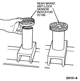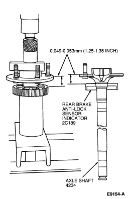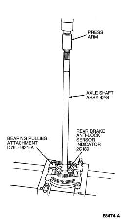 WARNING: DO NOT ALLOW AXLE SHAFT FLANGE TO CONTACT PRESS BED DURING REAR BRAKE ANTI-LOCK SENSOR INDICATOR (2C189)