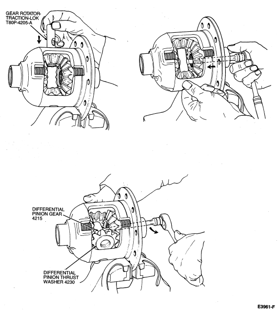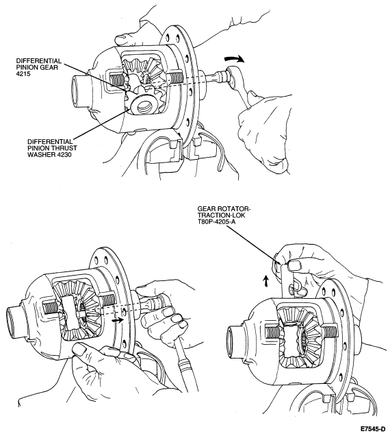 - Using Gear Rotator-Traction-Lok T80P-4205-A, rotate the differential pinion gears (4215)