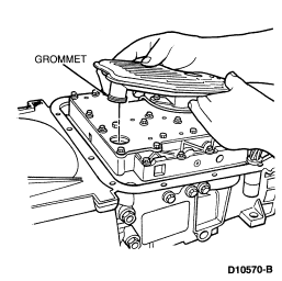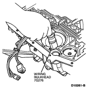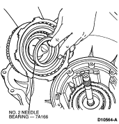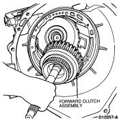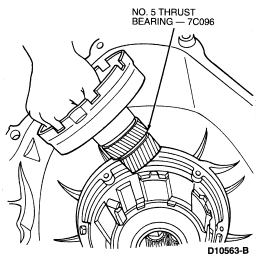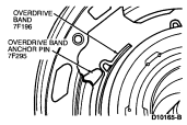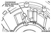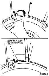 NOTE: Forward planetary assembly and planetary gear support assembly cannot be installed unless the notch cut in the planetary gear support assembly is aligned with the overdrive band anchor pin (7F295). Top of planetary gear support assembly should be below snap ring groove.