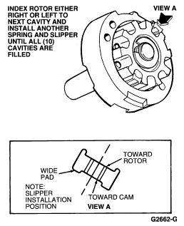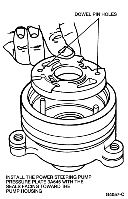 NOTE: When installing this assembly into power steering pump housing , the stepped holes must be used for the dowel pins, and the recessed notch in the cam insert must face toward the power steering oil reservoir and approximately 180 degrees opposite the square mounting lug on the aluminum housing. Refer to illustration under Assembly, Step 3.