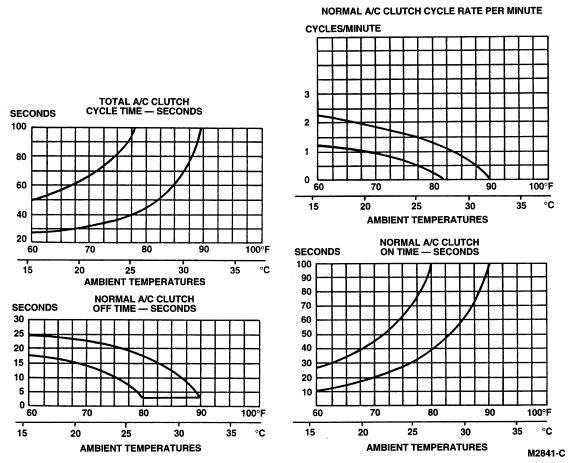 In ambient temperatures above 27°C (81° F), the A/C clutch will not normally cycle off. This will depend on local conditions and engine/vehicle speed. Also, A/C clutch cycling will normally not occur when the engine is operating at curb idle speed.