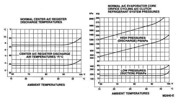 NOTE: When ambient temperature exceed 38°C (100°F), engine should be run at normal idle speed only. For tests in ambient temperatures between 38°C (100°F) and 43°C (110°F), system performance pressures will be the same as those for ambient. Temperatures shown on the chart in the 32°C (90°F) to 38°C (100°F) range. Center A/C register discharge temperatures will also be similar to those shown in the chart in the 32°C (90°F) to 38°C (100°F) range.