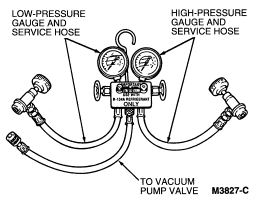 Attach the manifold gauge set. Leave both manifold gauge valves at the maximum clockwise (closed) position. Both gauges should show approximately 483-551 kPa (70-80 psi) at 24°C (75°F) with engine not running. If very little or no pressure is indicated, leave the vacuum pump valve closed, open the Refrigerant 134-a cylinder valve and set the low-pressure (suction) manifold gauge valve to the counterclockwise position. This opens the system to cylinder pressure.