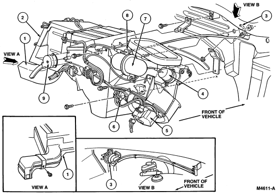 - Inside passenger compartment, remove one nut and one screw retaining A/C evaporator case mounting bracket (19A865)