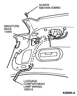 Remove screw retaining luggage compartment lamp (13A756) and pull luggage compartment lamp out.