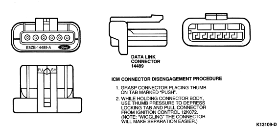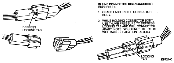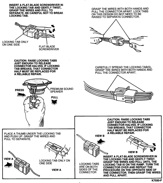 To remove a wire from the connector, release the retaining tang from the wire terminal with a narrow screwdriver and pull the wire and terminal out of the connector. To install, push the terminal into the connector until the retaining tang snaps into the locking hole in the terminal.
