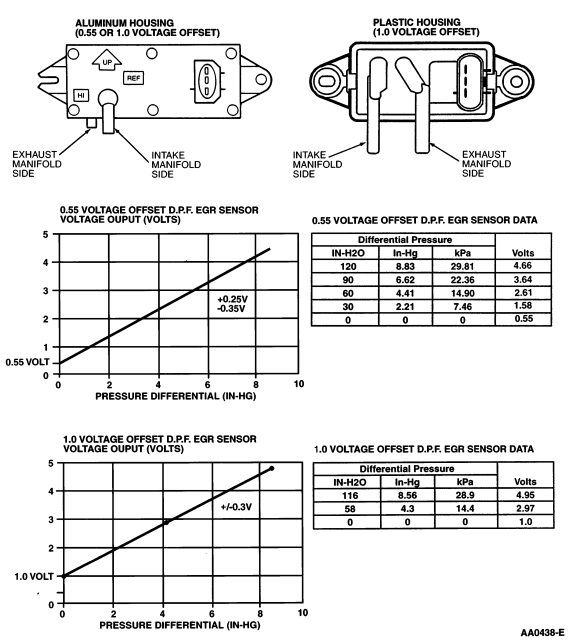 The differential pressure feedback EGR sensor (Figure 81) is a ceramic, capacitive-type pressure transducer that monitors the differential pressure across a metering orifice located in the orifice tube assembly. The differential pressure feedback sensor receives this signal through two hoses referred to as the downstream pressure hose (REF SIGNAL) and upstream pressure hose (HI SIGNAL). The HI and REF hose connections are marked on the aluminum differential pressure feedback EGR sensor housing for identification (note that the HI signal uses a larger diameter hose). The differential pressure feedback EGR sensor outputs a voltage proportional to the pressure drop across the metering orifice and supplies it to the PCM as EGR flow rate feedback.
