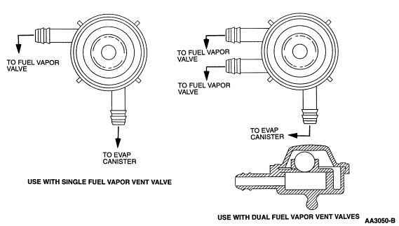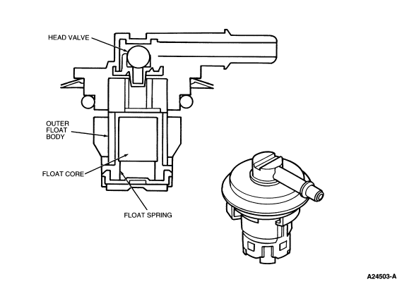 The fuel vapor control valve (Figure 92) is in series with the fuel vapor vent valve and the EVAP canister. This valve is referred to as a grade vent valve on some applications. The function of this fuel vapor control valve is to close the flow of liquid fuel to the EVAP canister purge valve or EVAP canister during refueling and to prevent the collection of liquid fuel in the fuel vapor hoses by overfilling the fuel tank.