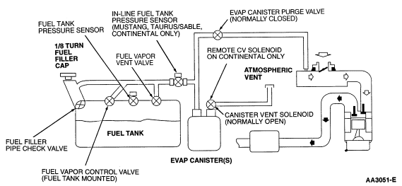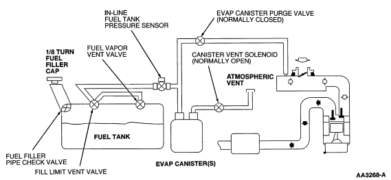 The Evaporative Emission (EVAP) system prevents fuel vapor build-up in the sealed fuel tank. Fuel vapors trapped in the sealed tank are vented through the vapor valve assembly on top of the tank. The vapors leave the valve assembly through a single vapor line and continue to the EVAP canister (located in the engine compartment, in the rear of vehicle near luggage compartment area or along the frame rail) for storage until the vapors are purged to the engine for burning.