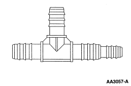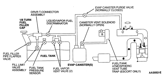 The fuel vapor recovery system primary component on the Escort/Tracer and Contour/Mystique is a fixed orifice and a roll-over check valve contained in a T - connector assembly (Figure 105). The T - connector assembly is located between the liquid/vapor fuel discriminator inlet port (hose) and the fuel tank vent tube path. The orifice recirculates fuel vapor to the fuel filler neck/pipe during the refueling process to displace fresh air (along with vapor) pulled into the fuel filler neck/pipe by the refueling nozzle. The system vapor generation is reduced by replacing the fresh air with the recirculated vapor. The roll-over feature of the T- connector protects against fuel from passing back from the fuel tank through the fuel filler neck/pipe and down the fuel filler recirculation tube during a crash roll-over. This prevents fuel leakage in cases where fuel vapor hoses or EVAP components may be displaced during a high speed crash.